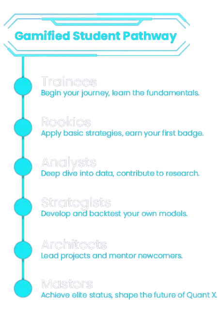 The world of quant is often guarded and intimidating. The founder’s vision for Quant X is to democratize this powerful field. We make it collaborative, easy to start, and use gamification to reduce drawdowns and prevent gambling like investing, fostering disciplined and strategic thinking.